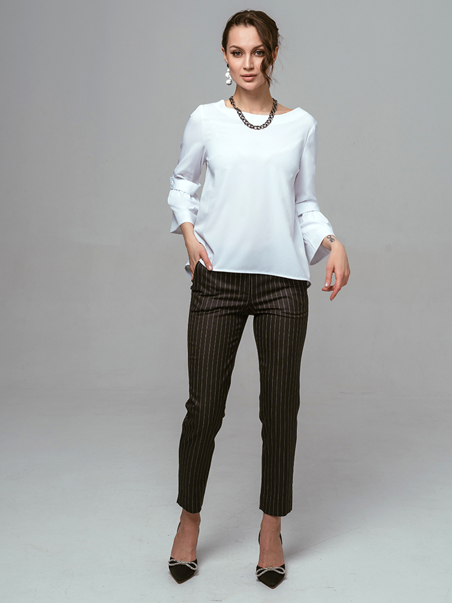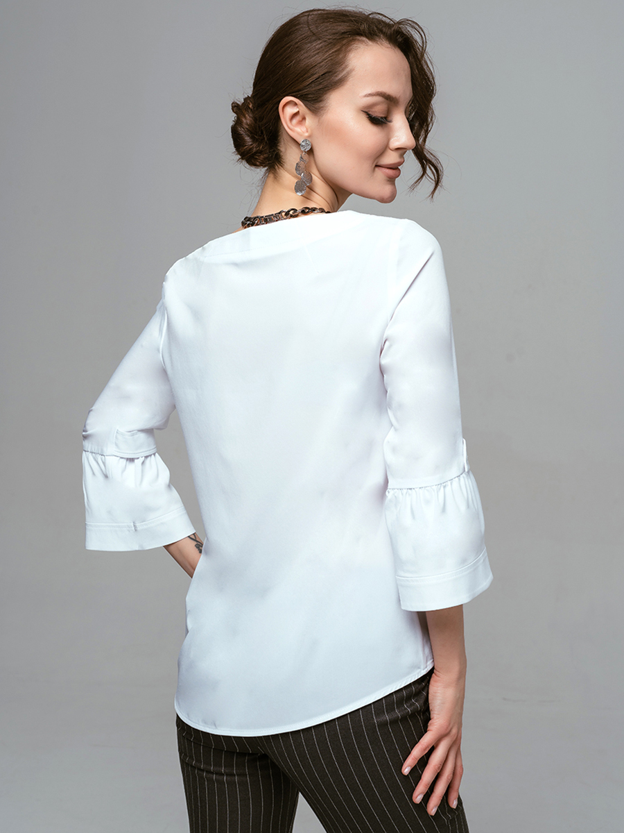 Элегантная белая женская рубашка, выполненная из мягкой вискозы, струящейся ткани, похожей на натуральный шелк. Состав - эластан 5%, вискоза 35%, полиэфир 60%. Ткань легкая, тонкая, прекрасно пропускает воздух, подойдет для жаркого лета и для офиса зимой. Рукав с воланом выполнен в соответствии с последними тенденциями моды, украшен красивым, женственным воланом и небольшой патой Офисная блузка слегка расклешенного силуэта прекрасно скрадывает и украшает фигуру. Если вам нравится более узкая посадка, рекомендуем взять на размер меньше. Блуза с фигурным низом, спинка чуть длиннее, чем полочка. Без карманов. Одевается через голову. Офисная рубашка подойдет даже для беременных с небольшим животиком. Блуза очень универсальная, будет уместно смотреться для вечернего образа, свидания, торжественного мероприятия. Ткань блузы относится к малосминаемой, не скатывается, легко стирается, утюжится.