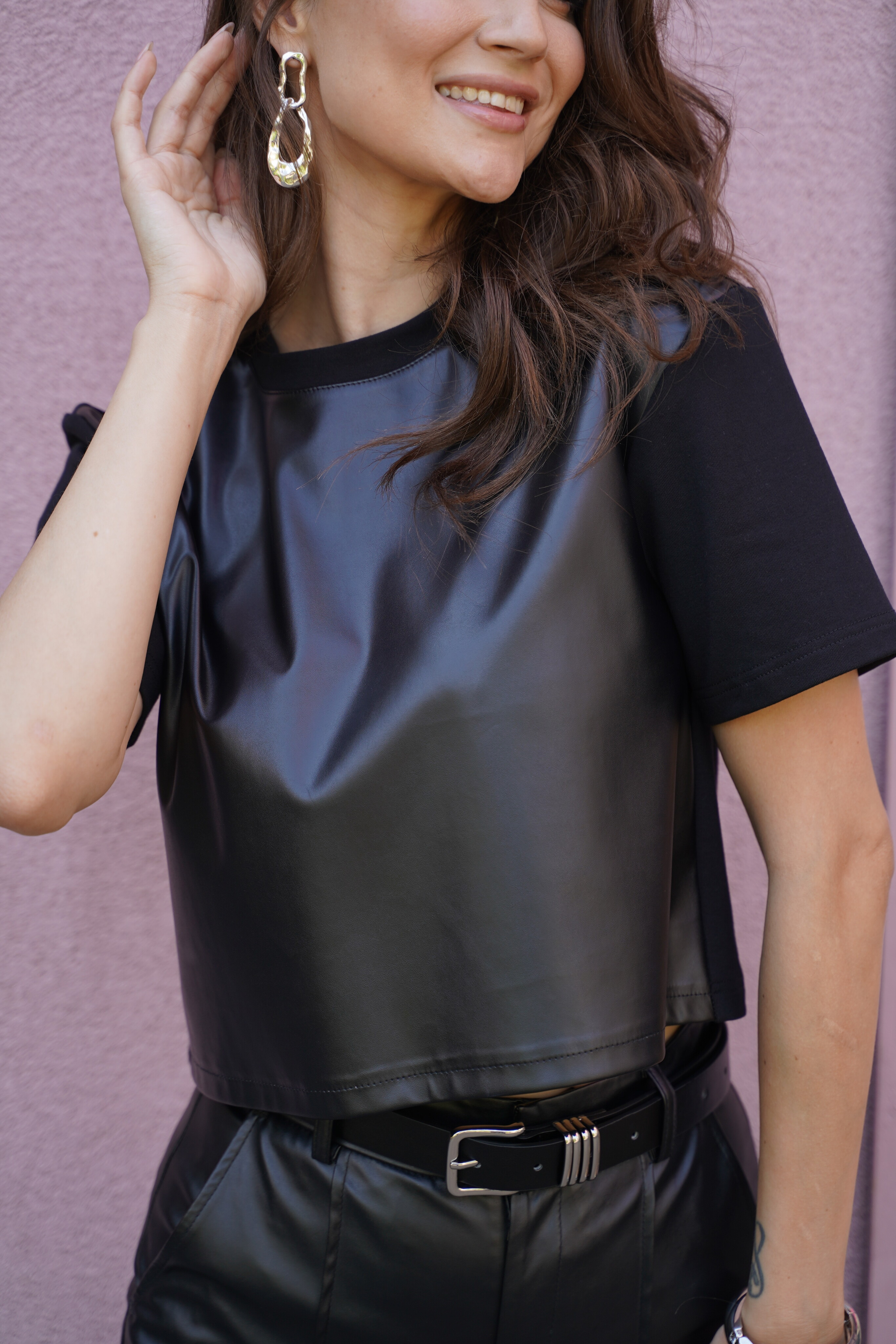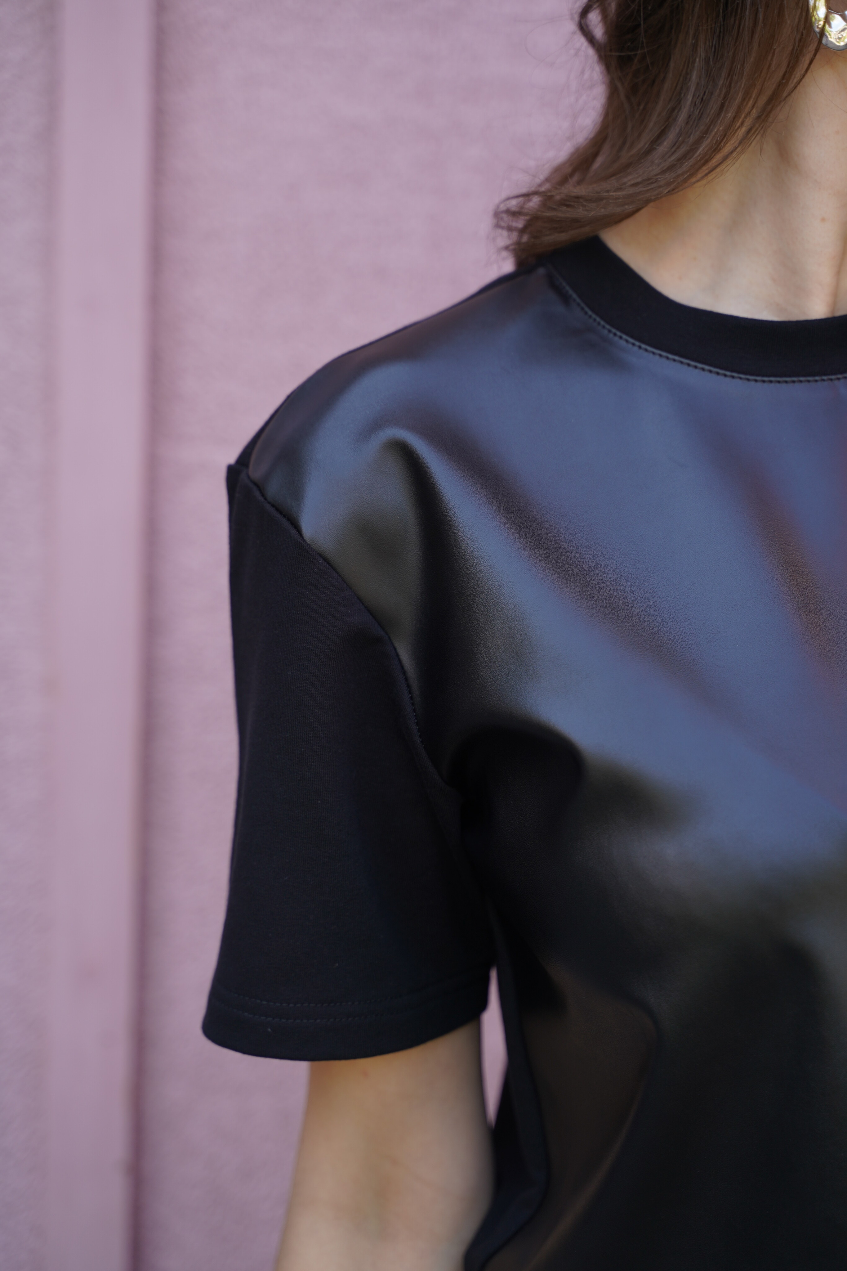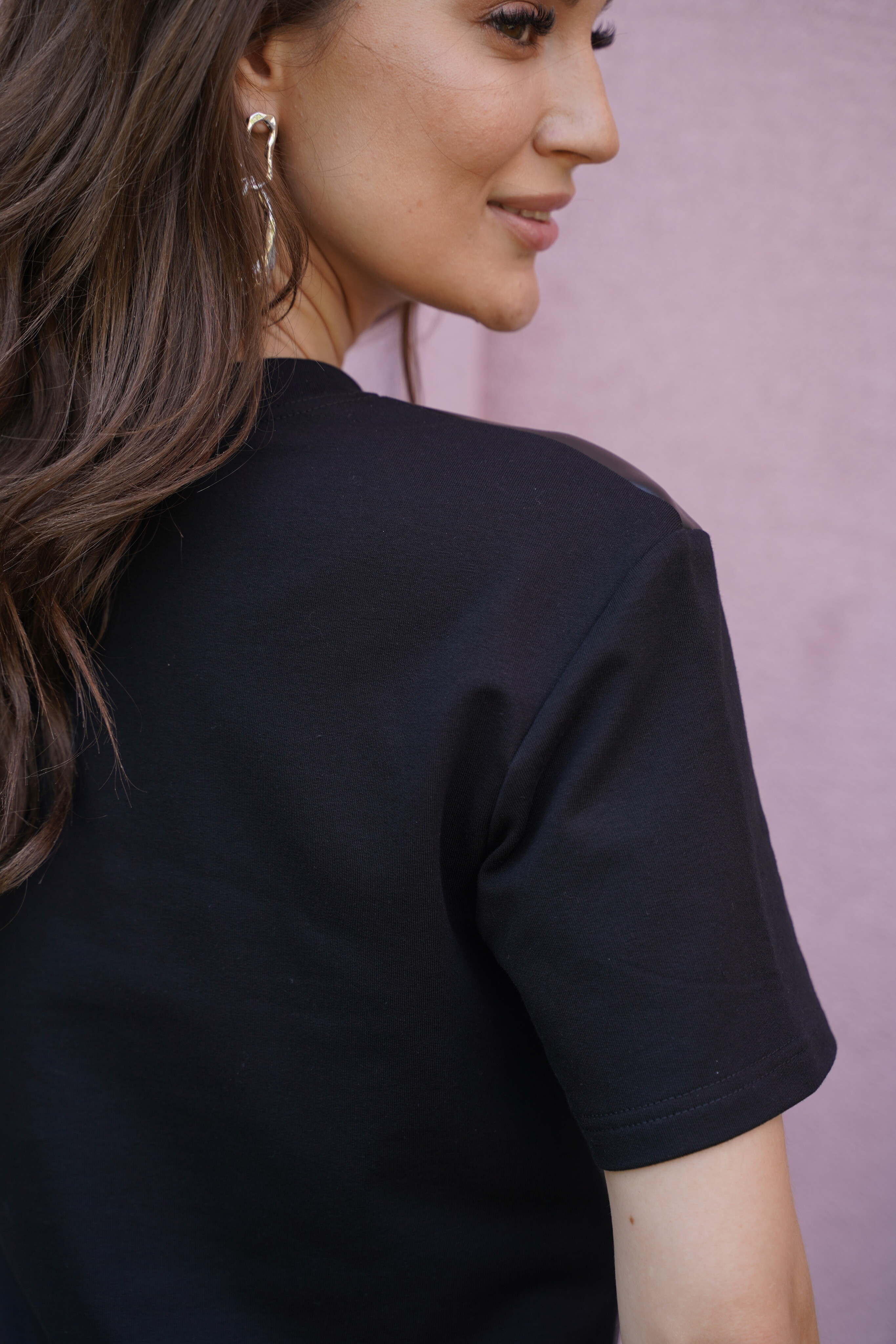 Блуза женская Бл-1015 а футер/экокожа, цвет черный.