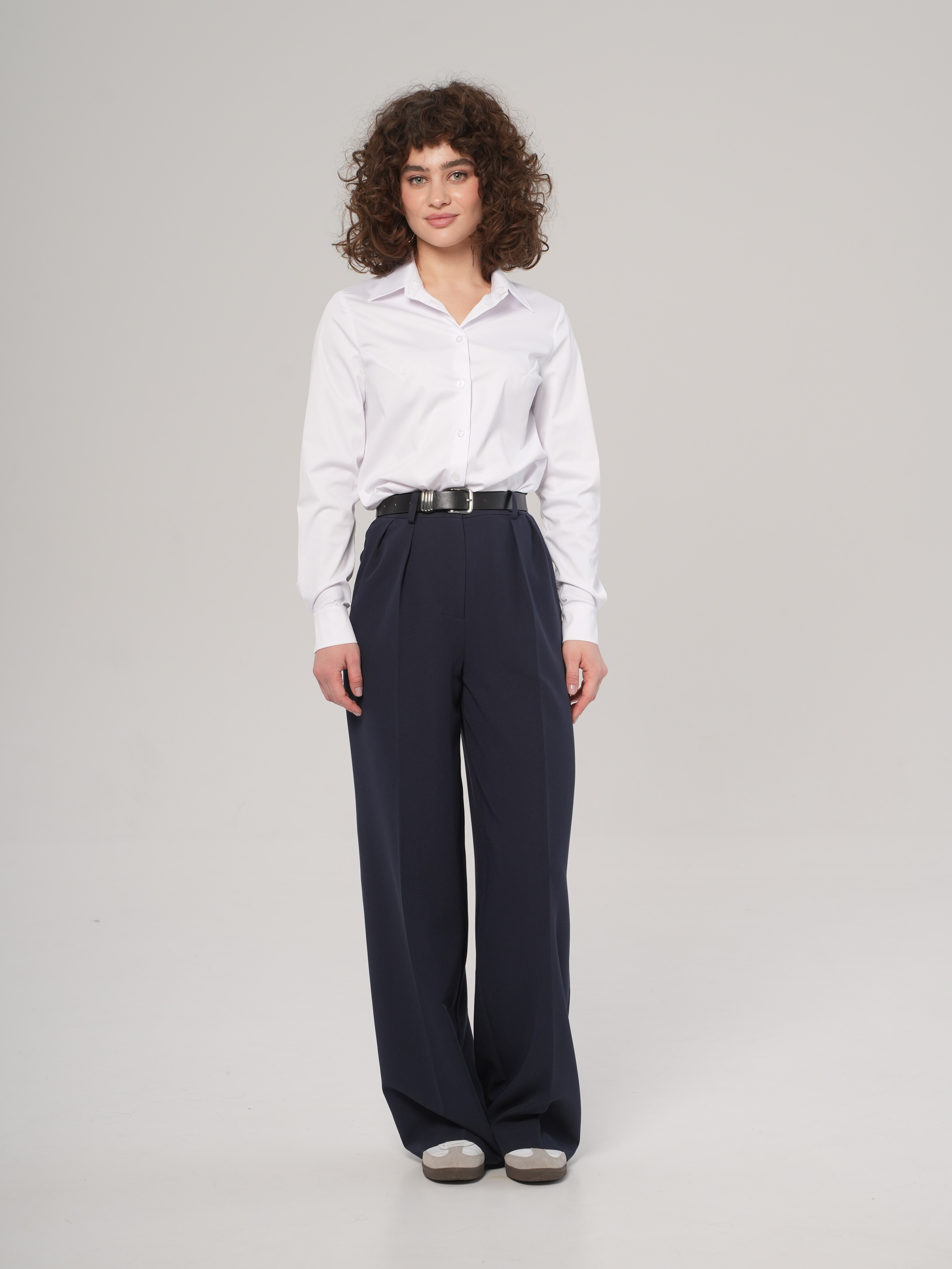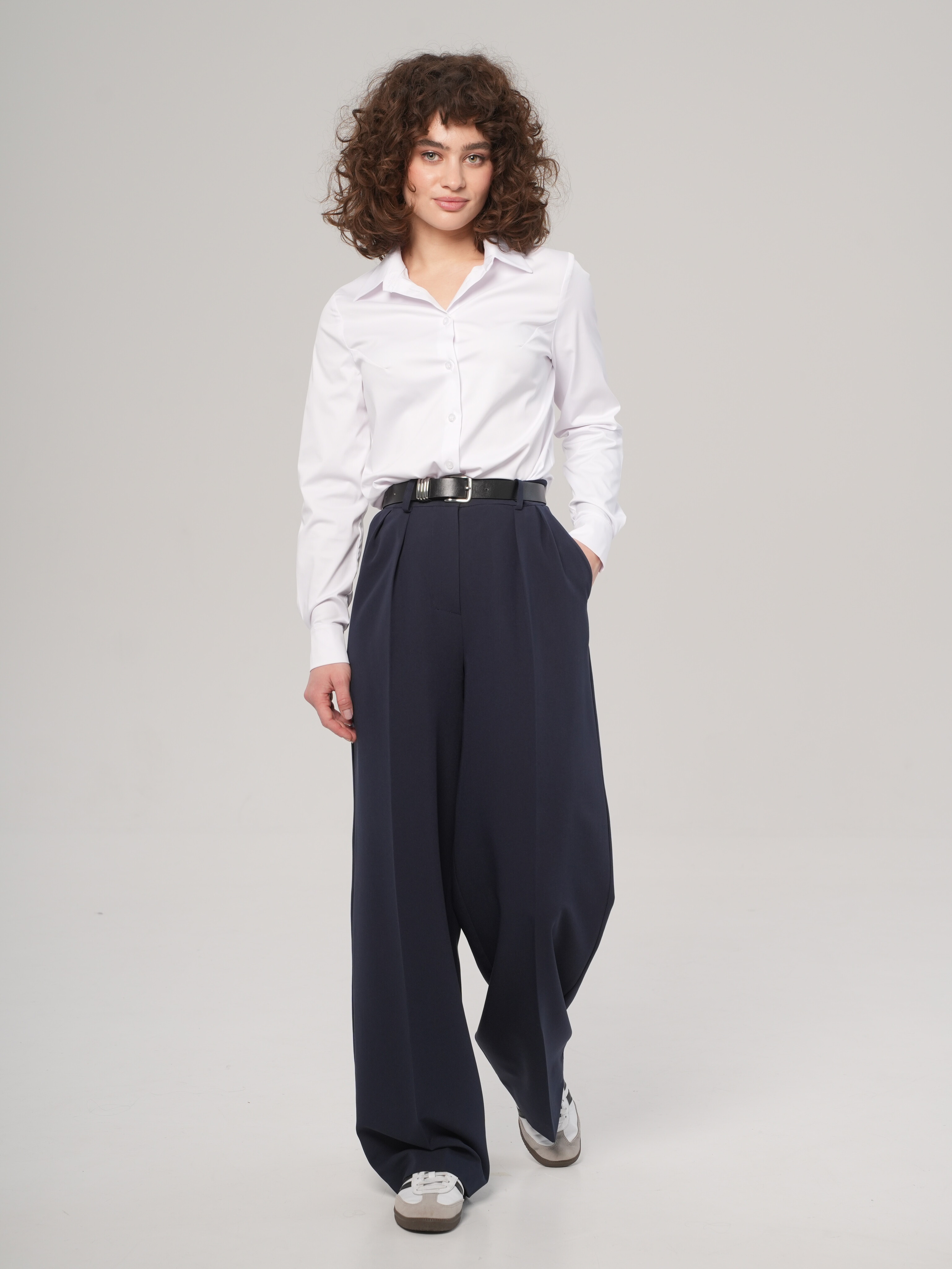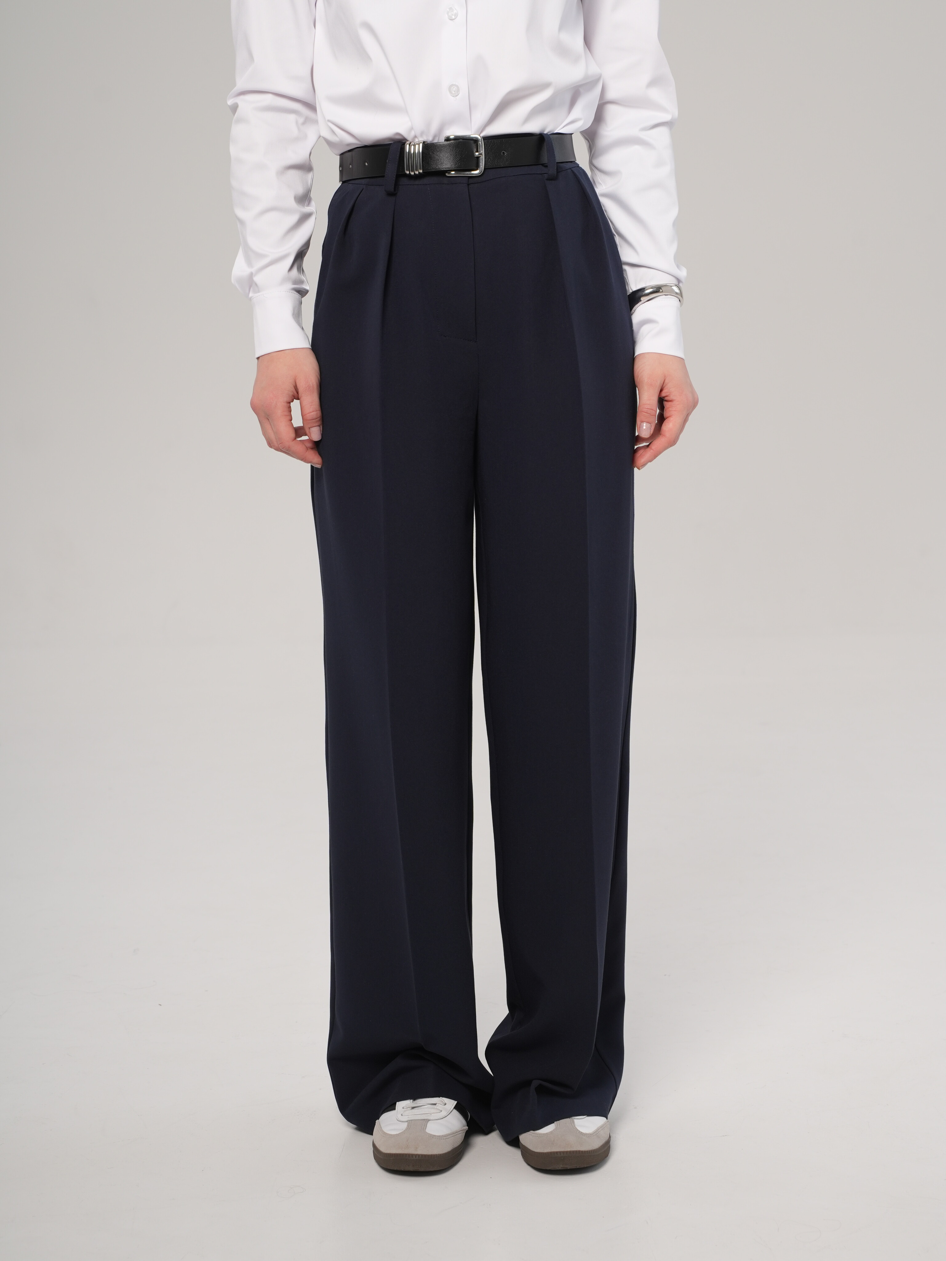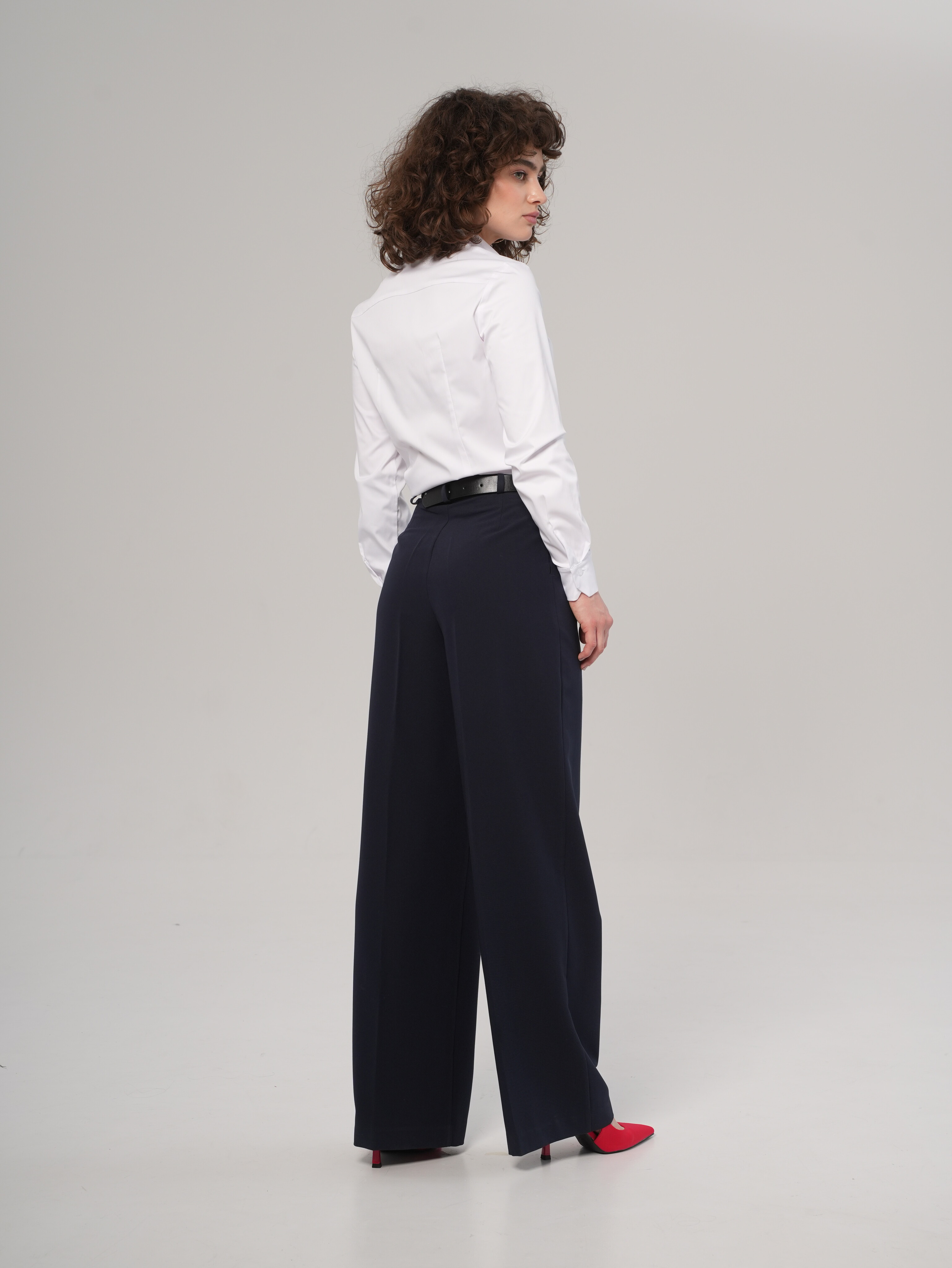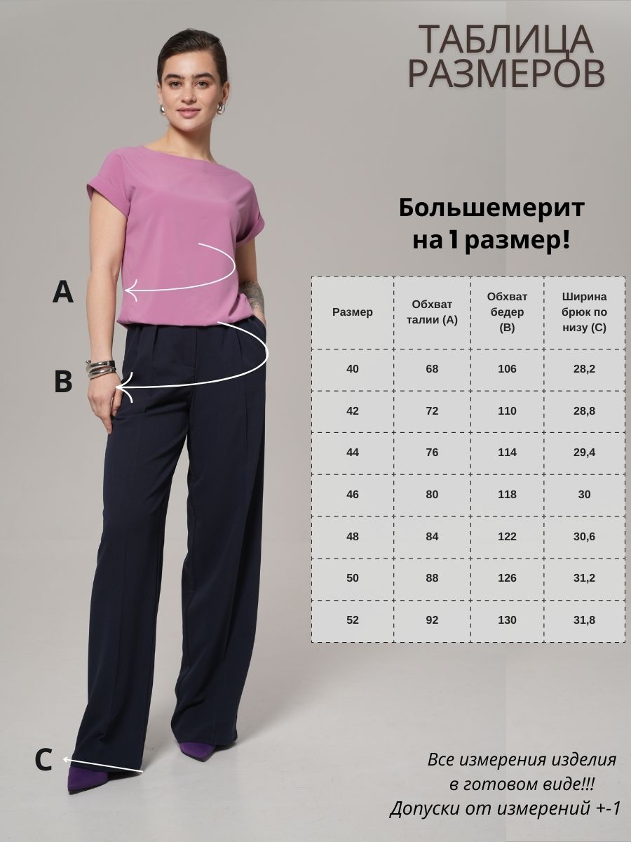 Брюки палаццо женские классические с высокой посадкой синие- это must have. Широкие брюки со складками участвовали во всех показах ведущих модных домов. Женские брюки палаццо выполнены из пластичной, мягкой и комфортной поливискозной ткани. Поливискоза – практичная, удобная ткань. Она сохраняет гигроскопичность и воздухопроницаемость на высоком уровне. Вам будет комфортно в них в офисе или на прогулке. Ткань относится к малосминаемой. Брюки палаццо женские классические с высокой посадкой синие подчеркивают женственность силуэта, скрывая при этом недостатки. Брюки школьные палаццо классические визуально стройнят фигуру за счет подчеркнутой линии талии, создающей силуэт «песочные часы».