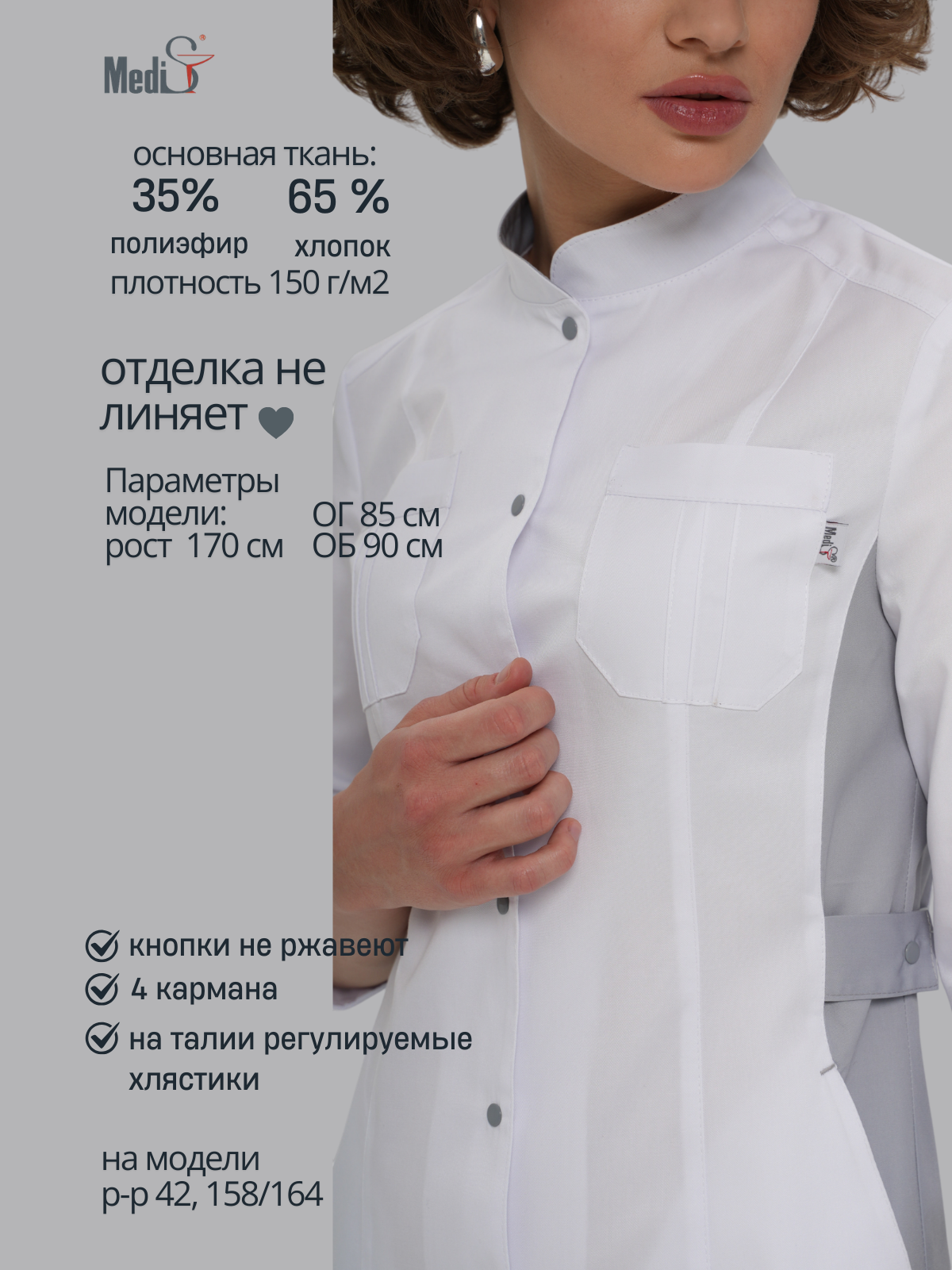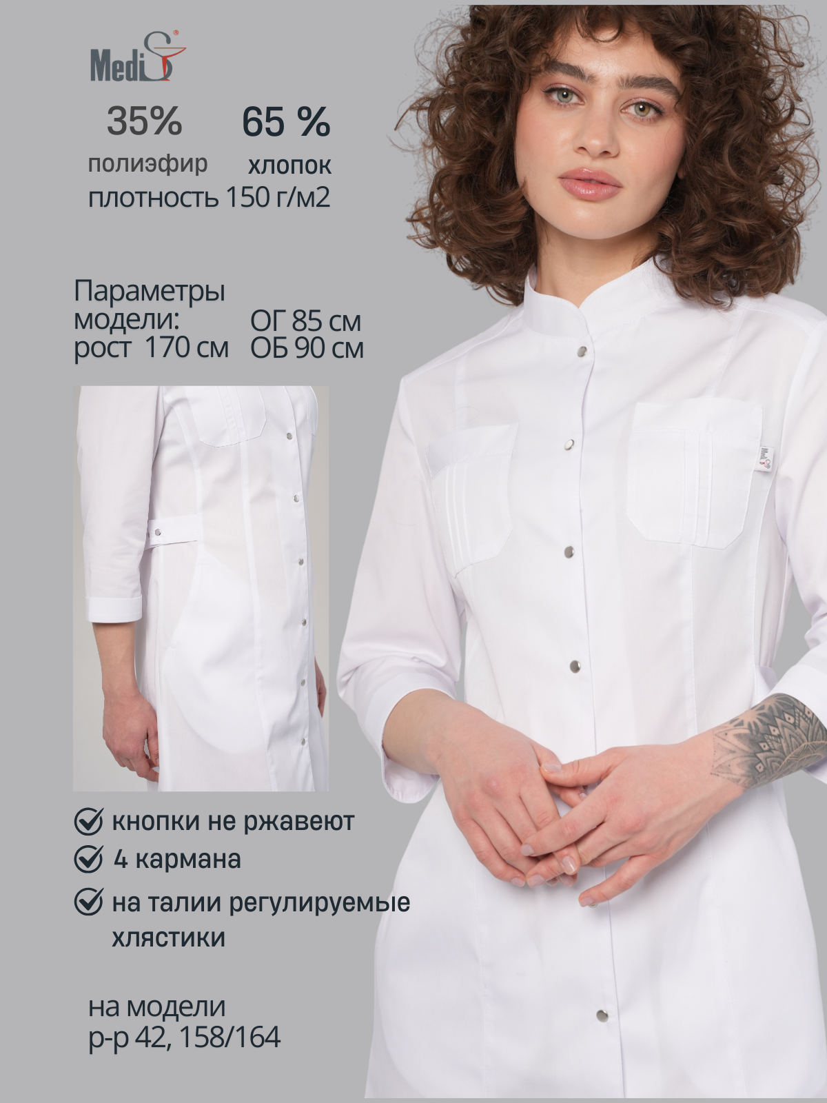 Изящный медицинский халат выполненный в минималистичном стиле с удобным рукавом ¾.