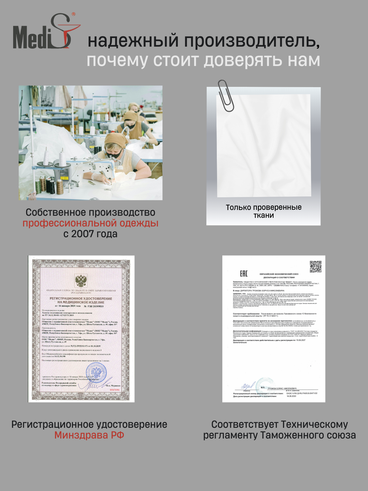 Качественный женский медицинский халат производства фирмы Медис (MediS) белого цвета с длинным рукавом и удобными накладными карманами.