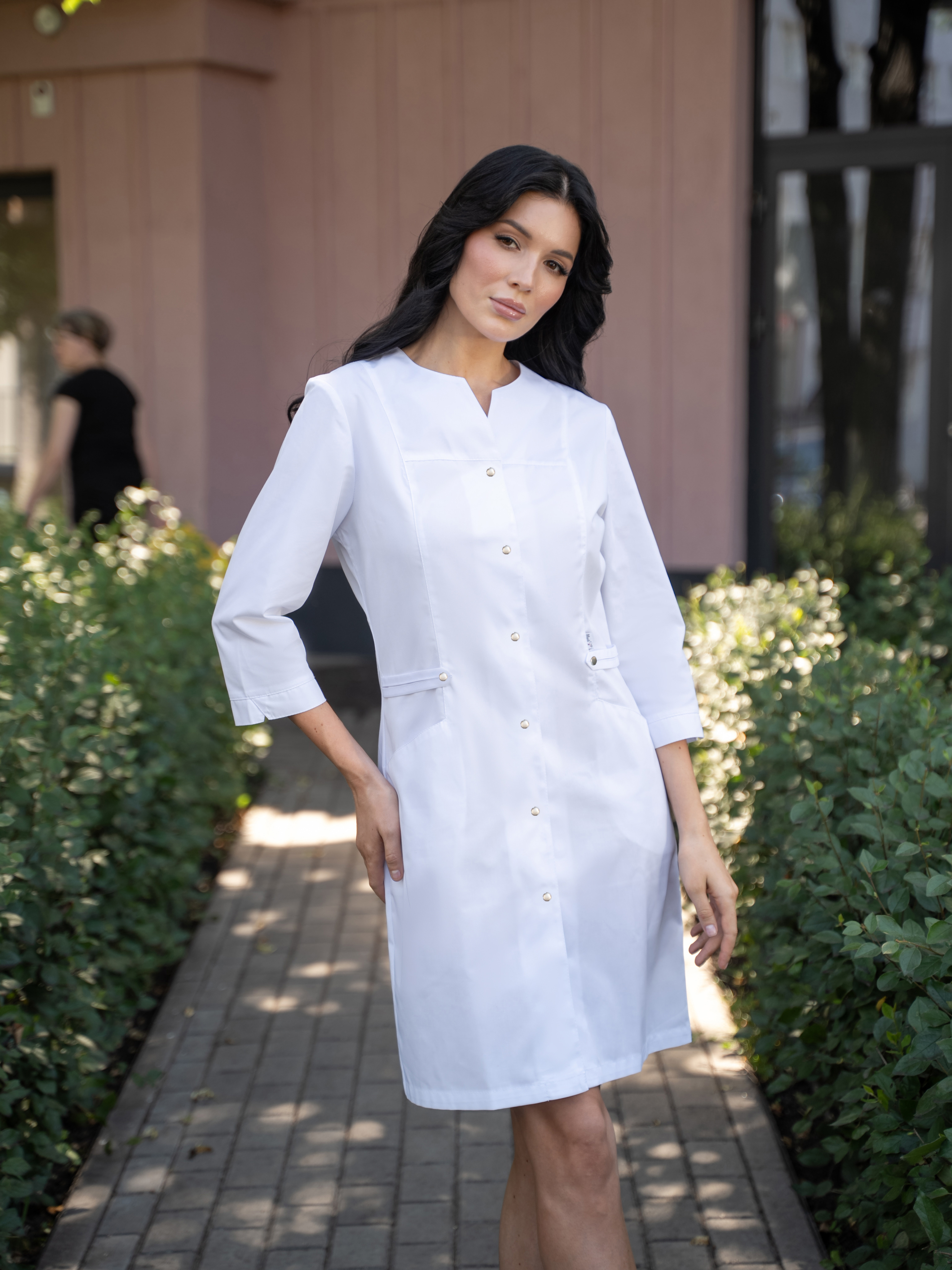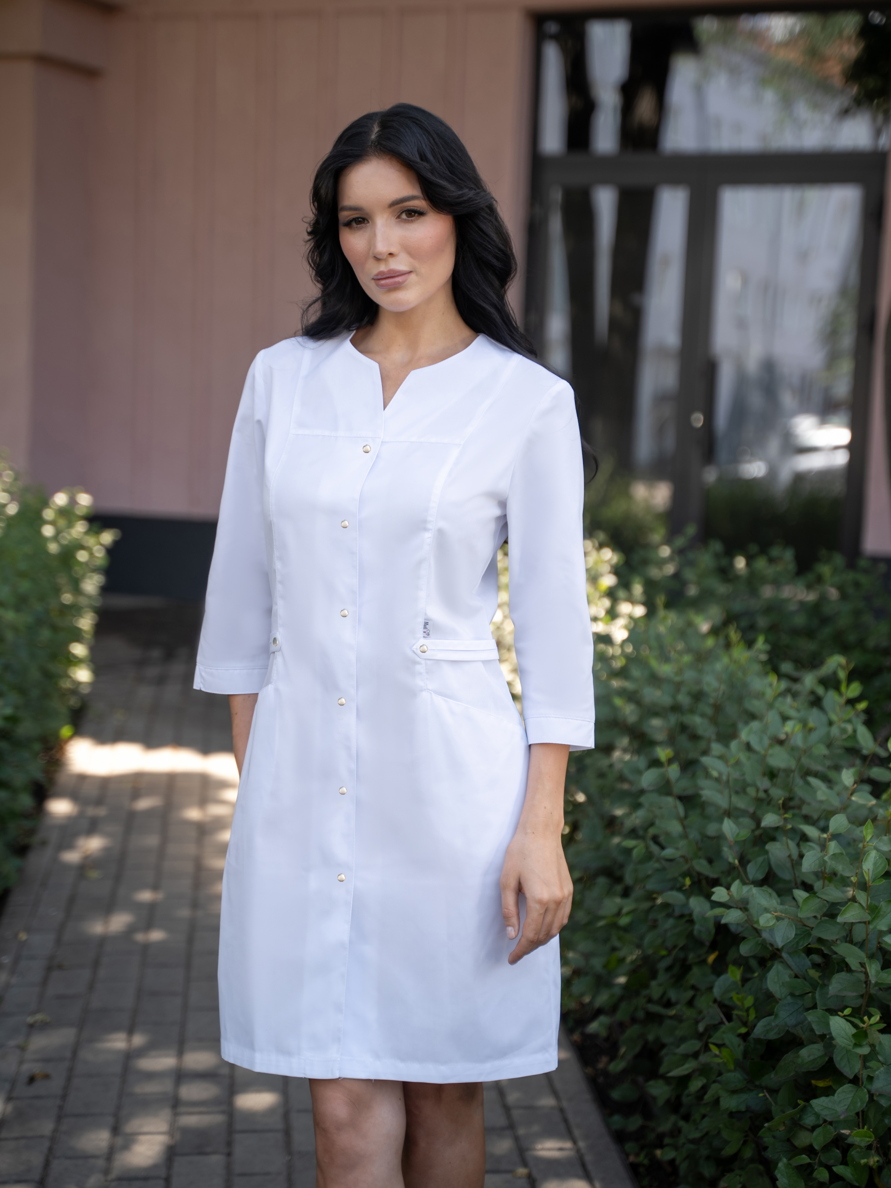 Элегантный медицинский халат полуприлегающего силуэта благодаря резинке на спинке. Рельеф из плеча выгодно вытягивает силуэт. О-образный вырез горловины со щелью выгодно удлиняет шею. Два вместительных кармана. Удобная длина рукава - 3/4. Халат застегивается на кнопки. Качественная ткань средней плотности не истирается и не выгорает.