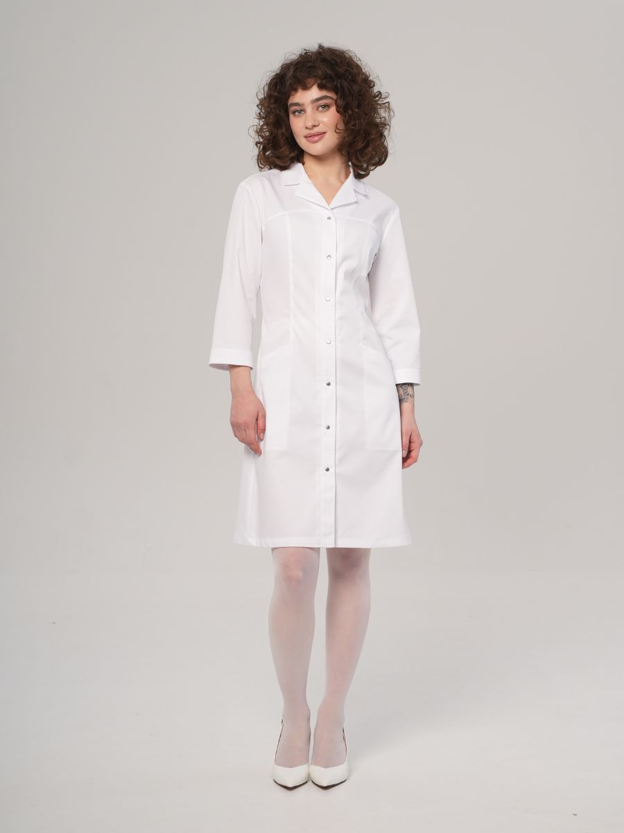 Халат медицинский женский стрейч от бренда MediS – это идеальный выбор для медицинских работников, ищущих комфорт и функциональность в своей рабочей одежде. Этот белый медицинский халат со стрейчем создан с использованием высококачественных материалов: 55% хлопок, 42% полиэфир и 3% спандекс, обеспечивающих не только долговечность, но и удобство носки. Вид застежки в виде пуговиц делает халат легко надеваемым и снимаемым, а прорезные карманы предлагают удобное хранение мелких предметов. Рука 3/4 и гладкая фактура материала добавляют халату элегантности и универсальности, делая его подходящим как для работы, так и для повседневного ношения. Женский дизайн халата MediS подчеркивает женственность и профессионализм, делая его отличным выбором для медицинских сестер и врачей.