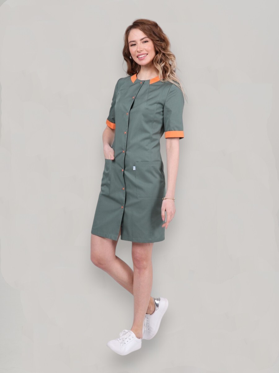 Практичный медицинский халат благородного оттенка хаки с оранжевыми вставками, которые добавляют оригинальности всему образу. Слегка укороченная длина изделия. Удобный рукав ½ (до локтя). Вместительные карманы. Халат застегивается на нержавеющие цветные кнопки. Ткань производства Япония, средней плотности, не тянется, очень качественная в носке, не истирается и не выгорает.
