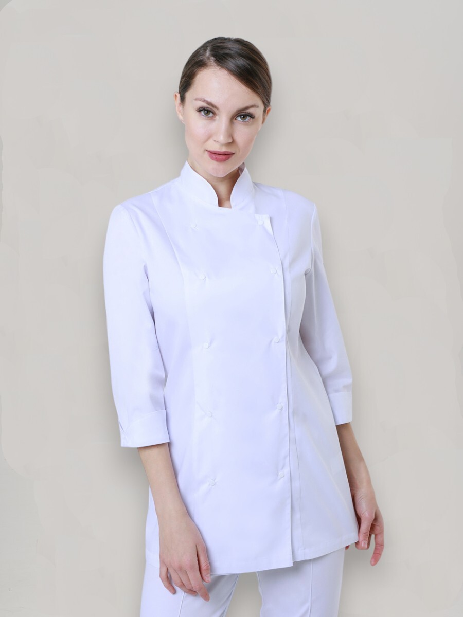 Женский китель поварской белого цвета с длинной рукава ¾.