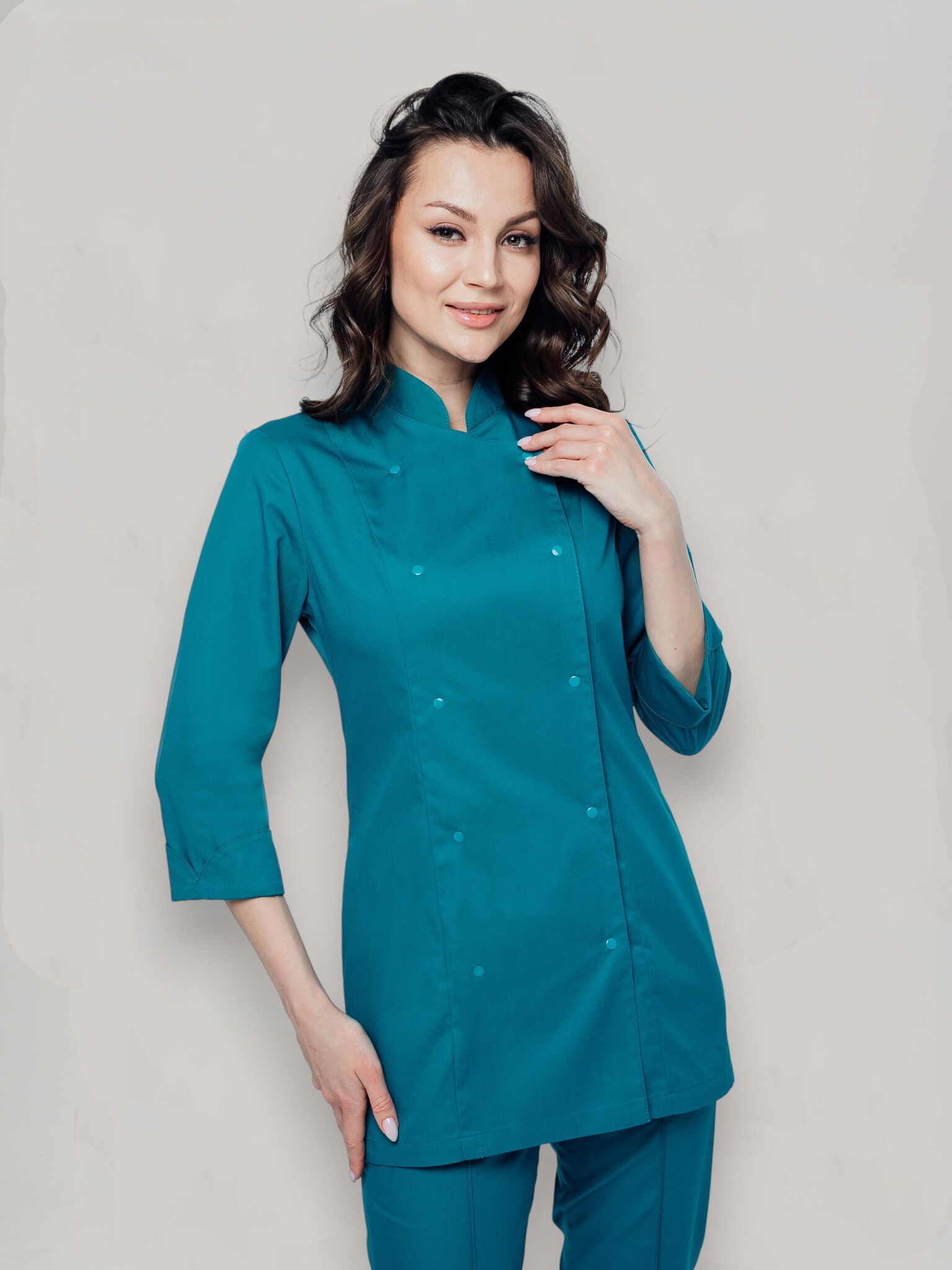 Женский китель поварской бирюзового цвета с длинной рукава ¾.