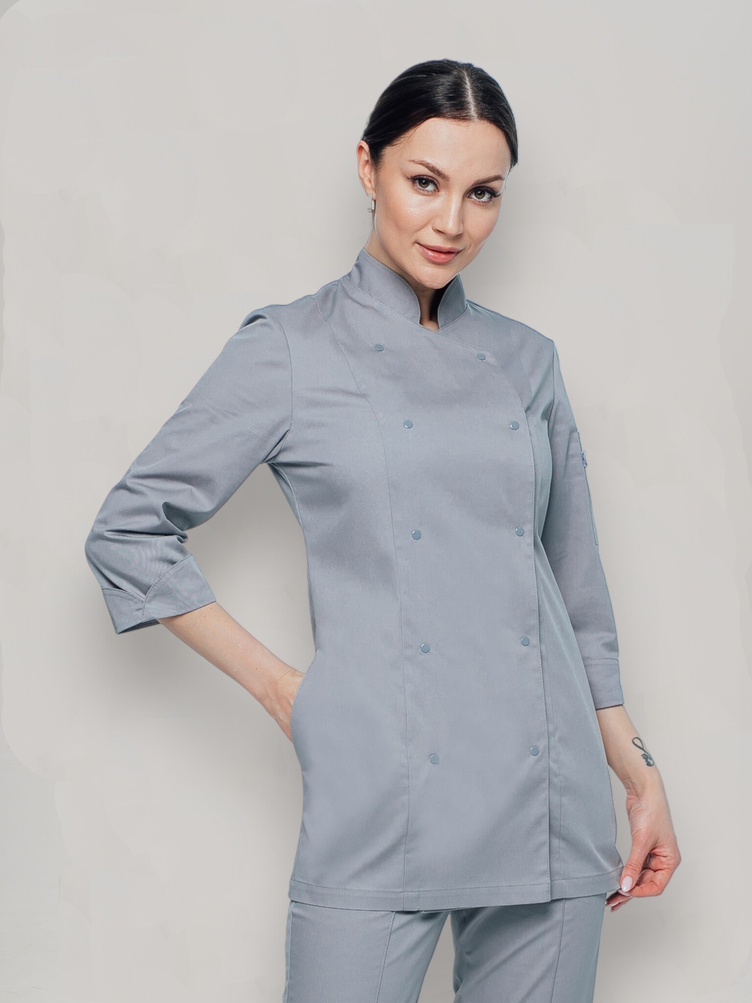 Женский китель поварской темно-синего цвета с длинной рукава ¾.