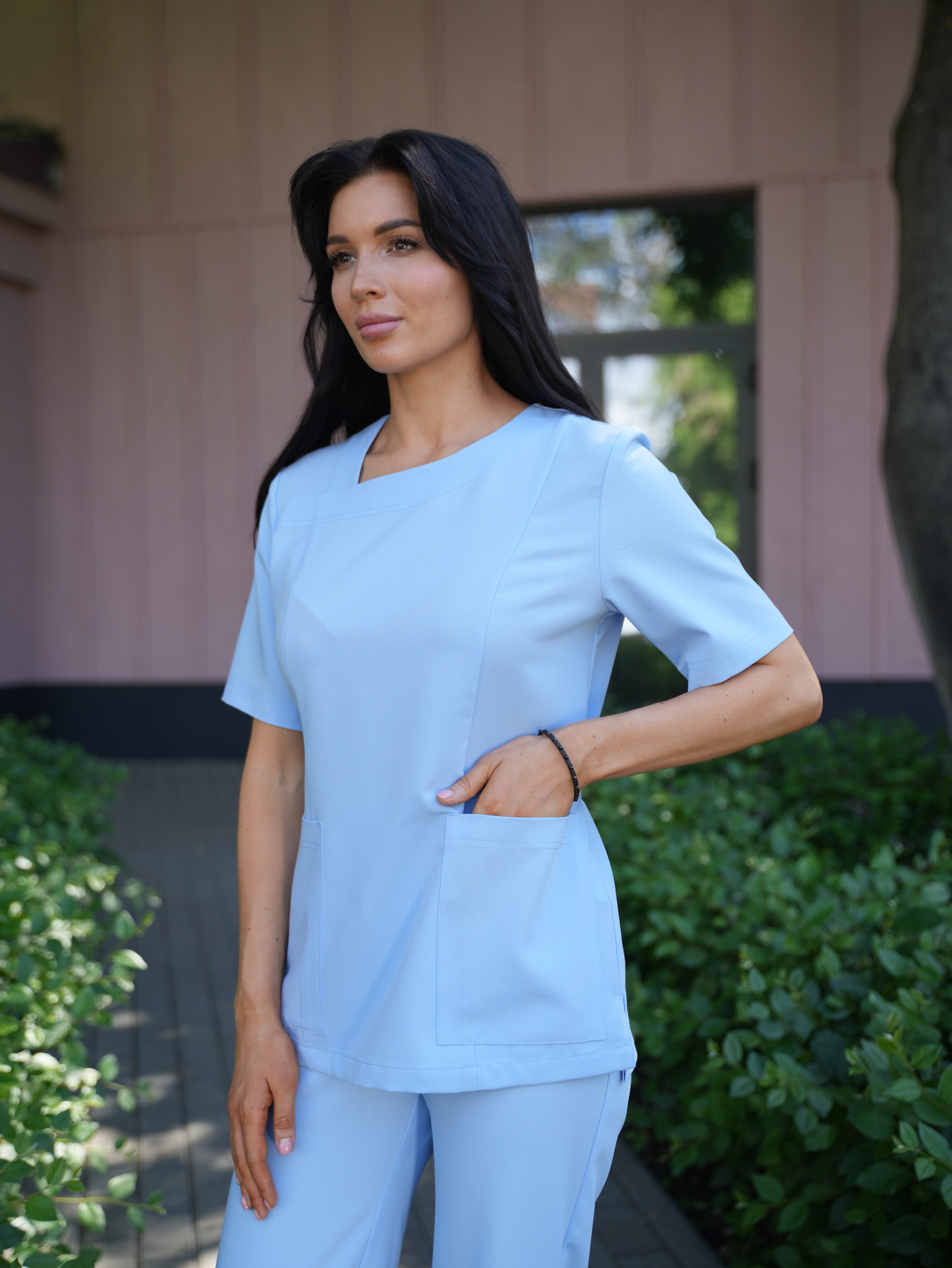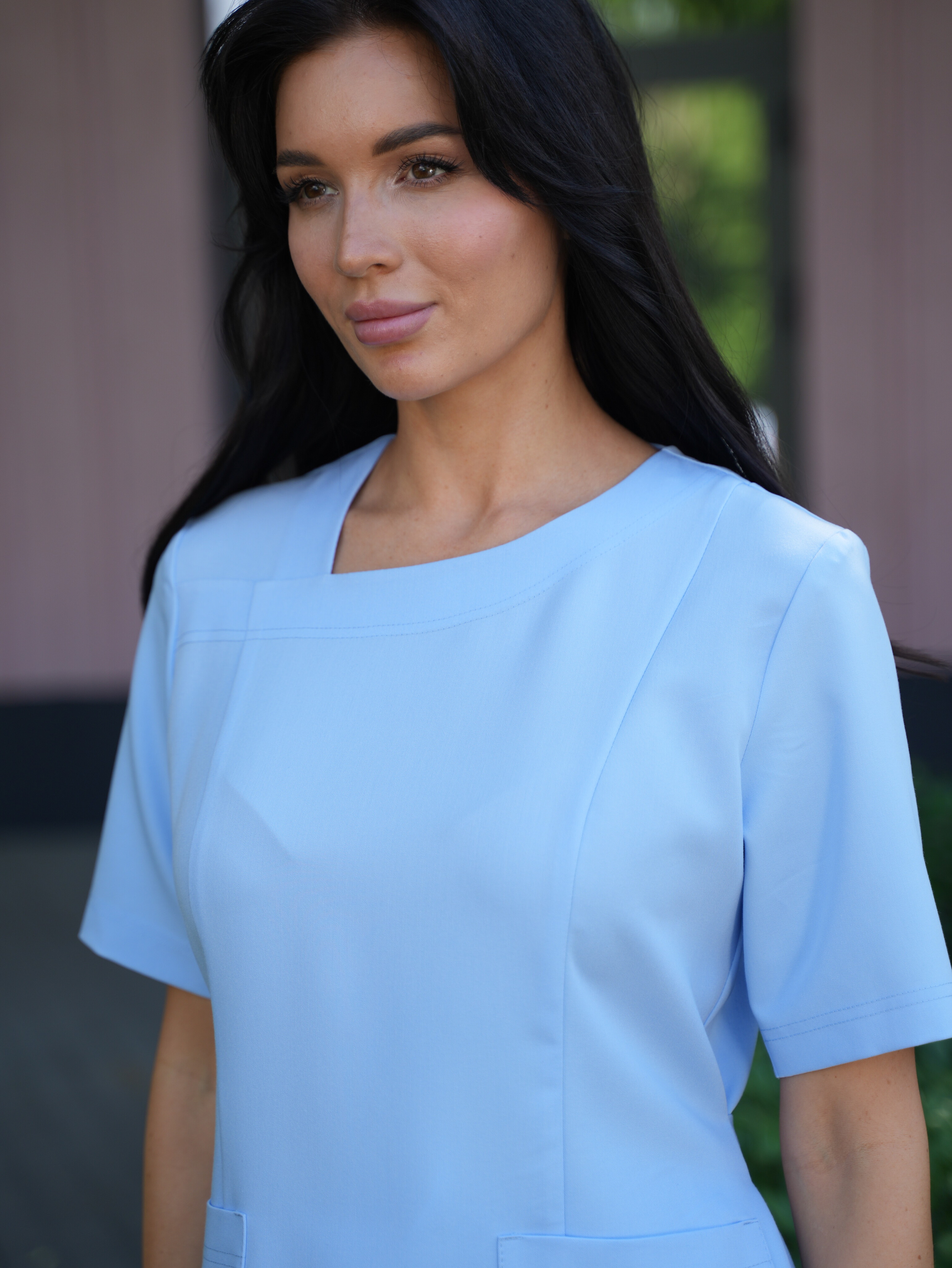 Стильная и красивая блуза медицинский женская премиум качества. Нежно голубой цвет одинаково уместен в терапевтическом или хирургическом направлении. Ткань с добавлением вискозы и стрейч мягко облегает, материал дышащий: помогает коже «дышать», дарит свободу движений и комфорт на весь день. Блуза с коротким рукавом подчеркивает легкость силуэта, не сковывает, остаётся практичным и гигиеничным. Для жарких кабинетов и интенсивных процедур это решение особенно удачно. Продуманная конструкция и эстетика деталей: приталенный крой формирует изящную талию, функциональные карманы держат всё необходимое под рукой.